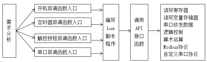 用戶根據應用需要,在回調函數里編寫Lua腳本程序,并下載到串口屏里。串口屏會根據回調函數類型,在不同的時間點執行對應回調函數里面的用戶Lua腳本程序。